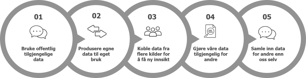 Trinn fire handler om å gjøre våre data tilgjengelig for andre. Data, som ikke må være konfidensielle, både kan og bør gjenbrukes. Verdien av dataene øker ved gjenbruk, uten å forringes. I motsetning til andre råvarer blir oppbrukt. Men her trengs det nye forretningsmodeller som fanger verdien av data, slik at tilbyderen får en kompensasjon av kjøperen. Det finnes teknologi i dag for mikrobetalinger som kan anvendes til dette formålet. En mikrobetaling er som navnet antyder et veldig lite beløp som overføres i en transaksjon mellom to parter. Transaksjonskostnadene må også være tilsvarende små, om betalingsløsningen skal være bærekraftig. Datafrigjøring skrev vi en kronikk om i 2019: Frigjør våre data for en kollektiv innovasjonskraft. Personlig tror jeg dette er en forutsetning for å høste gevinster i en helt annen skala enn det vi gjør i dag. Det synes jeg er så viktig og interessant at jeg vil følge opp dette temaet i senere innlegg.